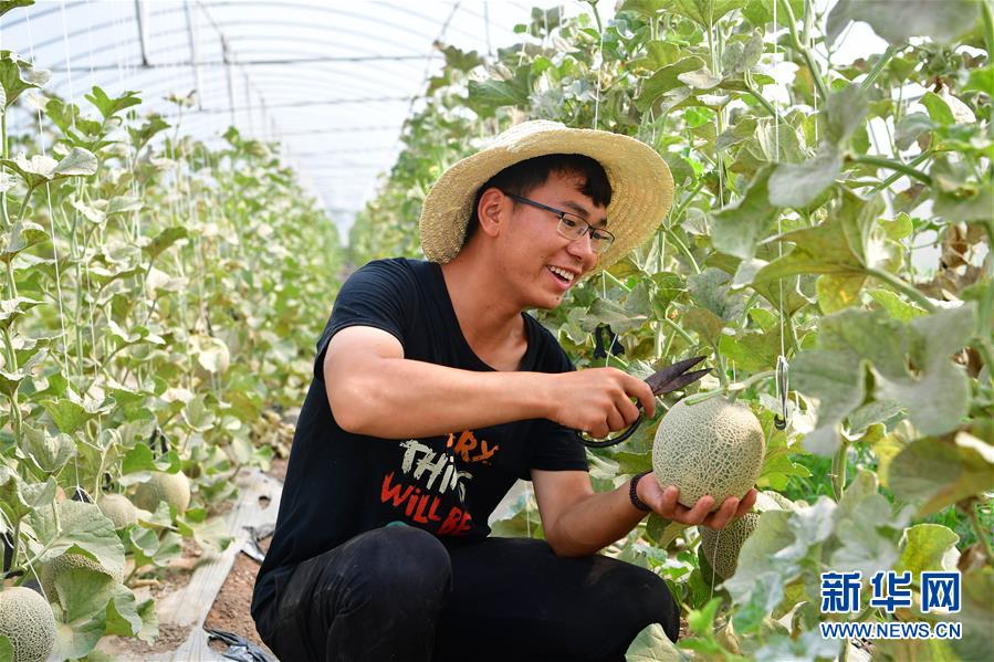 在河南兰考张庄村,一位年轻的“新农人”在大棚内采摘兰考蜜瓜(6月20日摄)。新华社记者 冯大鹏 摄
