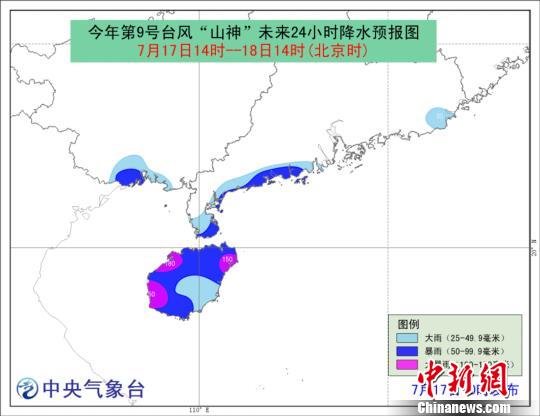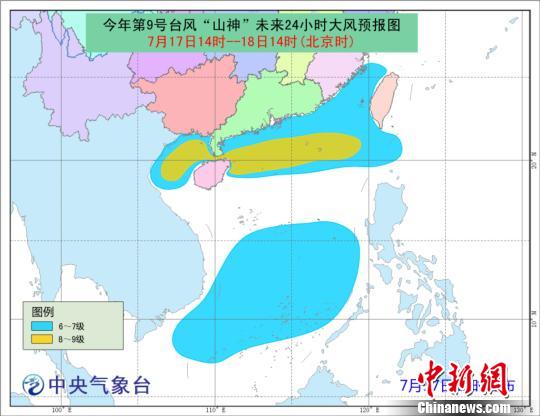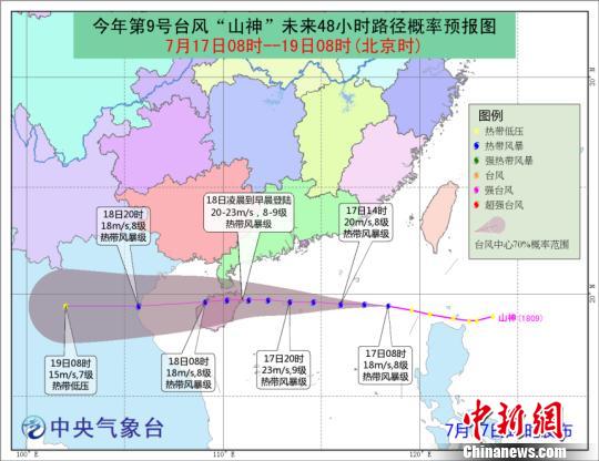 中新网海口7月17日电 (记者 洪坚鹏)今年第9号台风"山神"(热带风暴级),17日08时中心位于北纬19.4度、东经118.4度,也就是距离海南省文昌市偏东方向约800公里的南海海面上,中心附近最大风力8级,风速达到18米/秒。气象部门预计,该台风将以每小时45公里左右的速度向偏西方向移动,强度还将有所加强,并将于17日下半夜到18日早晨在海南陵水到广东雷州一带沿海登陆。