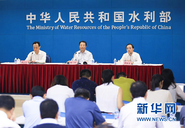 7月17日,在北京举行的全面建立河长制新闻发布会上,水利部部长鄂竟平(中)表示,截至2018年6月底,全国31个省(自治区、直辖市)已全面建立河长制,共明确省、市、县、乡四级河长30多万名,另有29个省份设立村级河长76万多名,打通了河长制“最后一公里”。 新华社发