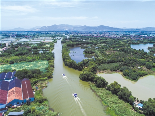 2018年7月10日,在浙江省湖州市东林镇保健村的河道上,河长及工作人员乘船巡河。新华社记者 徐 昱摄
