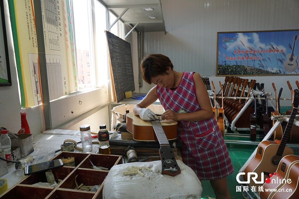 装配工郑娜娜正在给吉他上枕,修指板。(摄影 韩宇辰)