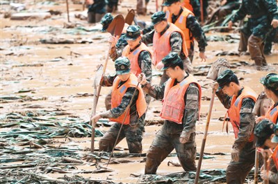 7月19日,武警临夏支队官兵在甘肃省临夏回族自治州东乡族自治县达板镇崔家村抢险救灾。新华社记者 陈 斌摄