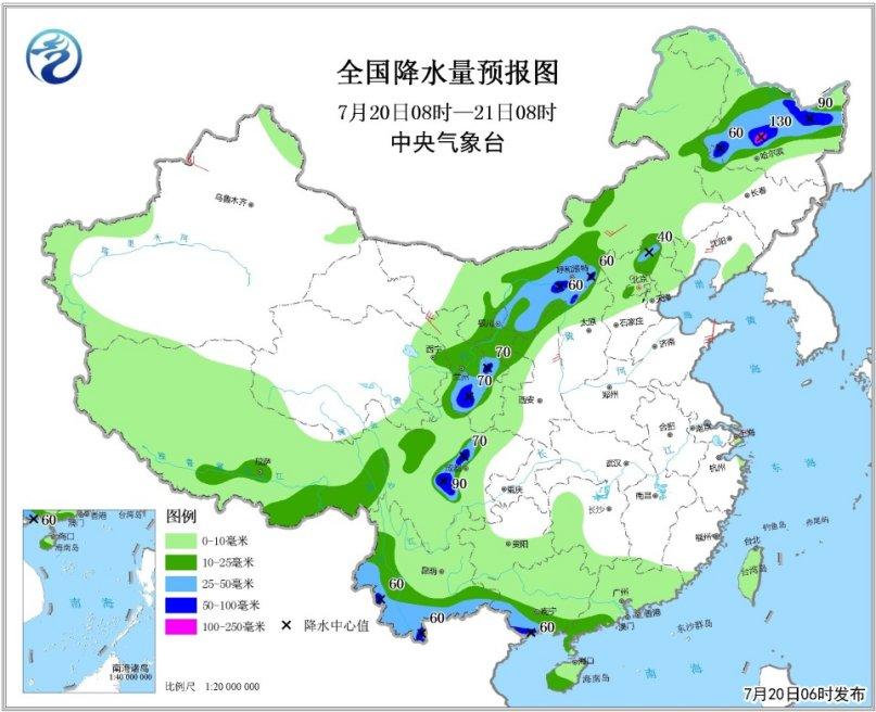 7月20日08时至21日08时,甘肃东部、宁夏、陕西北部、内蒙古中南部、河北北部、黑龙江中北部、四川盆地西部、云南西部和南部、广西南部、海南岛等地的部分地区有中到大雨,其中,甘肃东部、内蒙古河套地区、四川盆地西部、黑龙江中部、云南西部、广西南部等地局地有暴雨或大暴雨(100~130毫米);上述部分地区将伴有短时强降水(见图4)。