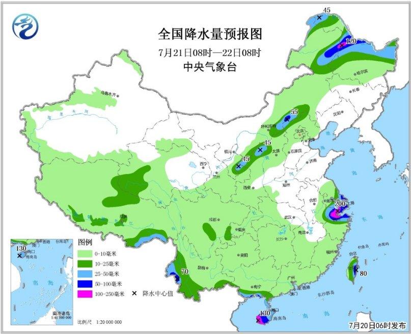 图4 全国降水量预报图(7月20日08时-21日08时)