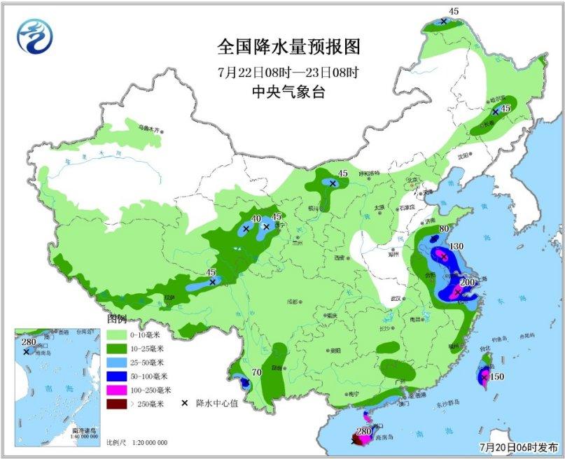 7月22日08时至23日08时,山东南部、安徽东部、江苏大部、浙江中北部、上海、华南南部沿海、海南岛、云南西部等地的部分地区有大到暴雨,其中江苏北部、浙江西北部、雷州半岛、海南岛等地有大暴雨,局地有特大暴雨(200~280毫米);上述部分地区将伴有短时强降水和雷暴大风等强对流天气(见图6)。北部湾、东海北部将有7~9级、阵风10级的大风。