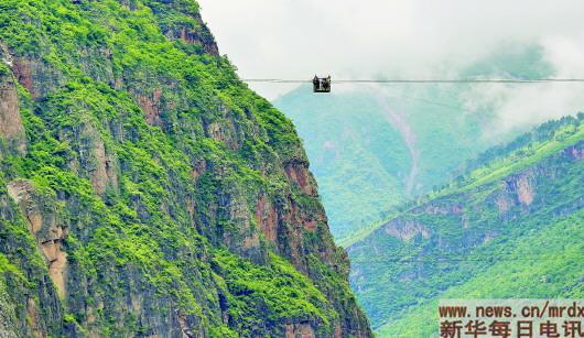 除了脚下的木板,溜框四面透风。刀削一样的赤色绝壁完整地呈现在我眼前,而脚下270米处褐色的江水翻滚奔腾。滑轮和钢绳摩擦发出的吱呀声,让初坐者不禁胆战心惊。