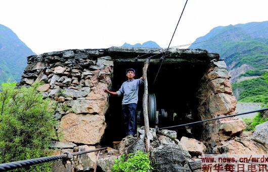 快到对岸鹦哥村时,身穿蓝色中山装的蒋世学按下开关断电,然后把一根手腕粗的木棍抵住了轮轴。当溜框稳稳地停在了一个人工凿出的小平台上的时候,我悬着的心才放下来。