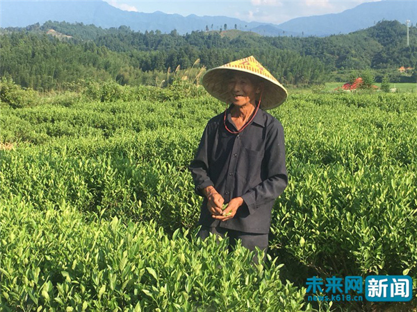 村民在井冈山新城镇黄金茶基地采茶,说起收入非常开心。未来网记者 杨佩颖摄。