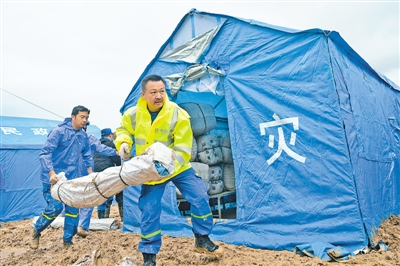 7月20日,甘肃省临夏回族自治州消防、电力、公安、卫生等部门会同当地干部群众以及志愿者对受灾严重的东乡族自治县展开道路清淤、设施抢修、受灾群众安置、隐患排查等工作,并将大批救灾物资运抵受灾地区。图为当日,蓝天救援队队员在东乡族自治县果园镇陈何村搬运救灾物资。新华社记者 陈 斌摄