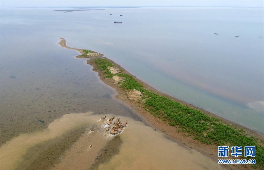 被野放的麋鹿在江西鄱阳湖湿地奔跑(4月3日无人机拍摄)。据国家林业和草原局统计,截至2018年7月8日,我国共有国际重要湿地57个、湿地自然保护区602个、国家湿地公园898个,湿地生态系统中有湿地植物4220种、动物2312种,湿地保护率达到49.03%。 新华社记者 周密 摄