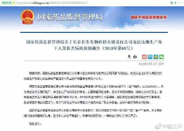 7月15日,国家药监局称,近期查获一批生产记录造假的狂犬疫苗,长春长生生物科技有限责任公司的冻干人用狂犬病疫苗生产存在记录造假等严重违反《药品生产质量管理规范》行为。