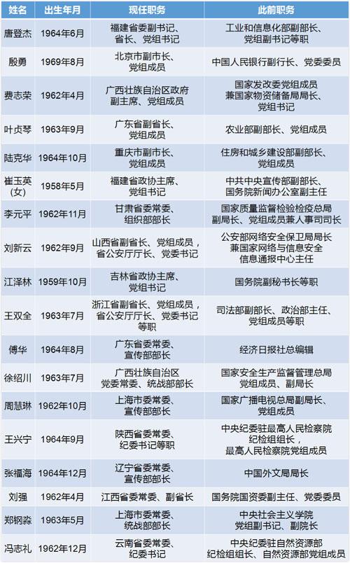 从履新职务来看,10人出任省级党委常委领导班子成员,其中3人为宣传部部长,2人为统战部部长,2人为纪委书记。他们是福建省委副书记、省长唐登杰,甘肃省委常委、组织部部长李元平,广东省委常委、宣传部部长傅华,广西壮族自治区党委常委、统战部部长徐绍川,上海市委常委、宣传部部长周慧琳,陕西省委常委、纪委书记王兴宁,辽宁省委常委、宣传部部长张福海,江西省委常委、副省长刘强,上海市委常委、统战部部长郑钢淼和云南省委常委、纪委书记冯志礼。