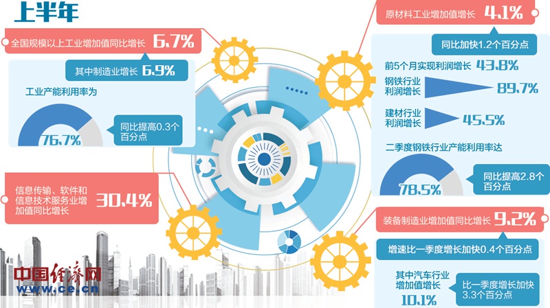 数据显示,上半年全国规模以上工业增加值同比增长6.7%,其中制造业增长6.9%;工业产能利用率为76.7%,同比提高0.3个百分点。信息传输、软件和信息技术服务业增加值同比增长30.4%。