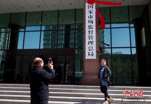 资料图:4月10日,新组建的国家市场监督管理总局在北京正式挂牌。图为民众与新牌合影。中新社记者 贾天勇 摄