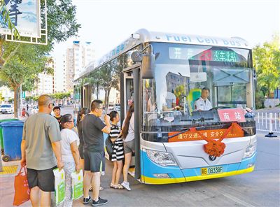 7月25日,市民在张家口市区准备乘坐氢燃料电池公交车出行。近日,河北省张家口市引进的49辆氢燃料电池公交车和25辆氢燃料电池大客车投运,这标志着张家口市在河北省率先迈入氢能源时代。该市今年还将再购置170辆氢燃料电池公交车,年底前全部投入运营。