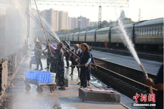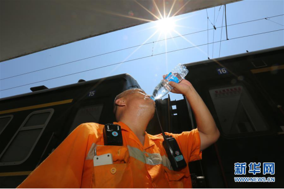连日来,湖北襄阳遭遇高温天气,襄阳火车站上水吸污班的工人们坚守岗位,每天在站台下的股道往返,用汗水维护暑期旅客列车的清新洁净。