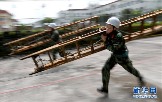 7月24日,上海消防员在进行六米拉梯训练。连日来,上海持续高温,上海消防开展夏季大练兵活动,进行消防传统体能项目和日常救援专业技能训练,在高温环境下磨砺意志,提高实战能力。