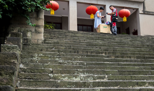 2018年7月25日,重庆枇杷山正街,黄正伟将客户的货品送到指定地点。这一片区地理高差极大,爬坡上坎是家常便饭。