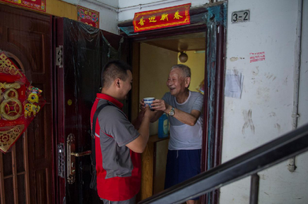 2018年7月25日,重庆金刚塔小区,黄正伟将小区独居老大爷购买的保健品送到家里后,老人一定要小黄喝杯水再走。