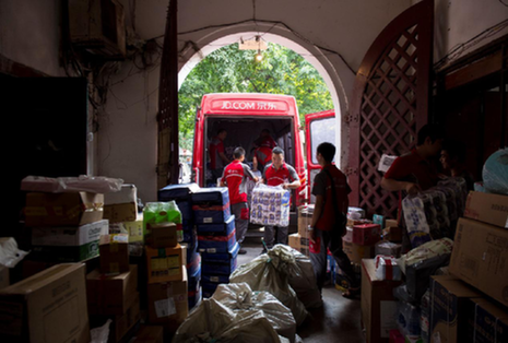 2018年7月25日,重庆大田湾体育场,黄正伟和同事们正在卸车。