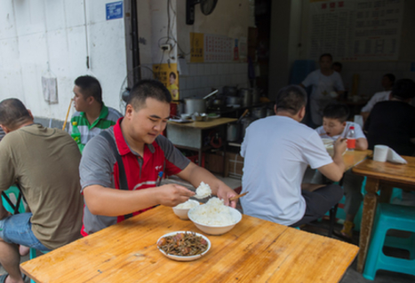 2018年7月25日,重庆中山一路,黄正伟的午饭。每天因为劳累,黄正伟的食欲很好,做了快递员,长了20斤。他开玩笑说这是“工伤”。