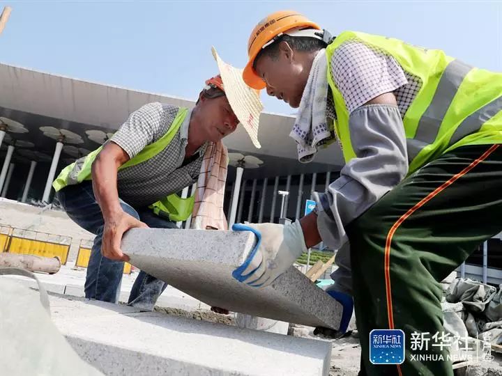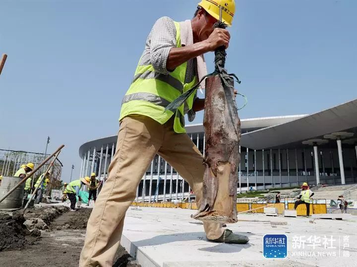 7月26日,上海发布高温橙色预警,在国家会展中心南广场建设工地上工人们在施工,争取早日完成场馆升级改造工作。新华社记者 方喆 摄