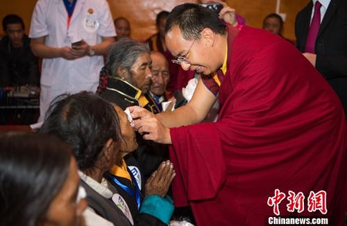 7月31日,援助西藏发展基金会、爱尔眼科医院集团“日喀则慈善光明行”捐赠仪式在日喀则的扎什伦布寺举行。仪式上,援助西藏发展基金会理事长班禅额尔德尼·确吉杰布为术后的白内障患者代表揭开纱布并赠送护目眼镜。中新社记者 何蓬磊 摄