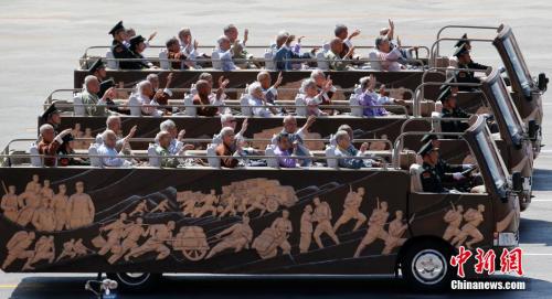 资料图:2015年9月3日上午,纪念中国人民抗日战争暨世界反法西斯战争胜利70周年大会在北京隆重举行。图为抗战老兵乘车方队通过天安门广场。中新社记者 盛佳鹏 摄