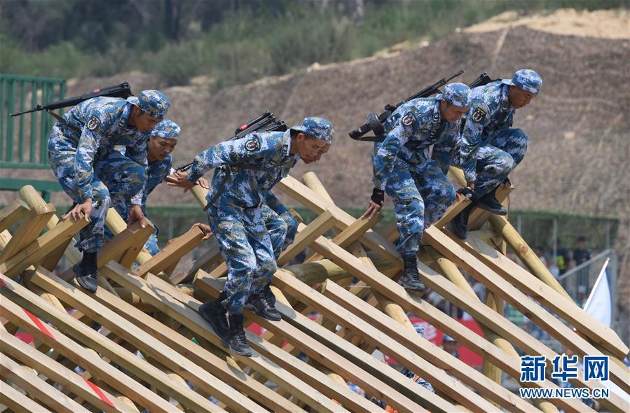 中国参赛队员在“国际军事比赛-2018”海上登陆赛障碍赛中通过树干鹿砦(7月30日摄)。新华社记者 姜克红 摄