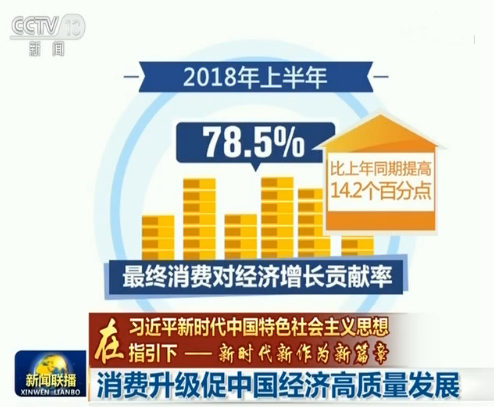 央视网消息(新闻联播):习近平总书记近日强调,下半年,我们要坚持稳中求进工作总基调,在保持经济社会大局稳定的基础上,在改革开放和结构调整等方面积极进取,加强统筹协调,形成政策合力,扎实细致工作,稳就业、稳金融、稳外贸、稳外资、稳投资、稳预期,做好民生保障和社会稳定工作,统筹做好经济社会发展工作,保持经济平稳健康发展。如今,进入2018年下半年的中国经济,将如何稳字当头,在高质量发展上有所作为呢?新闻联播从今天起推出《中国经济稳中前行》,今天我们首先关注消费升级促中国经济高质量发展。