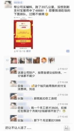8月1日,武汉一服装厂员工小张在帮公司采购时,意外获得支付宝4888元的余额宝红包大奖,本以为是天降喜事,没想到小张老板知道后,一口咬定奖金属于公司,还要求从小张的工资中扣掉红包的金额,相当于小张一个月白做了。事情发生后,小张觉得很委屈:“钱是自己中的,为什么要交给公司?”他在武汉19楼论坛发帖寻求意见,引发网友热议。