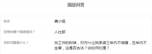对此,国是直通车询问相关法律业界人士,其直言:“被要求承诺多少年内不结婚生育,这属于变相性别歧视,是违法的。”