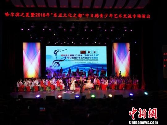 中新网哈尔滨8月5日电 (刘瀚文 记者 刘锡菊)5日,由哈尔滨市教育局主办、哈尔滨市少年宫承办的哈尔滨之夏暨2018年“东亚文化之都”中日韩青少年艺术交流专场演出在哈尔滨市少年宫举行。