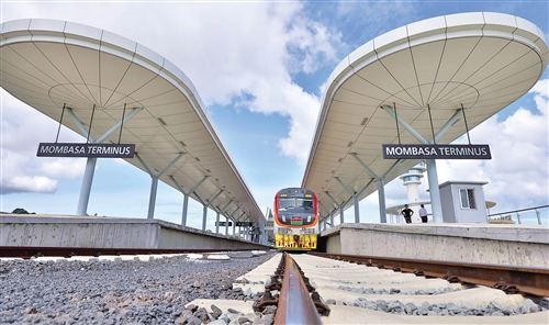 2017年5月31日,连接肯尼亚东部港口城市蒙巴萨与首都内罗毕的蒙内铁路正式开通。蒙内铁路全长约480公里,是肯尼亚独立以来的首条新铁路,是一条采用中国标准、中国技术、中国装备建造的现代化铁路。截至2018年6月10日,蒙内铁路累计发送旅客近138万人次,平均上座率超过95%,为肯尼亚创造近5万个工作岗位,受到肯尼亚政府和民间高度认可。图为列车停靠在肯尼亚蒙内铁路蒙巴萨站。 新华社记者 王 腾摄