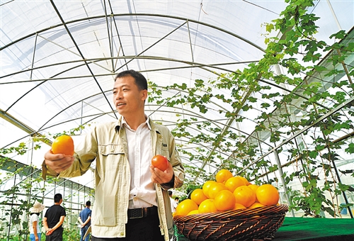 鄂尔多斯杭锦旗亿利阿木古龙甘草健康产业园有机果蔬示范区里瓜果飘香。这里的实践表明,只要科学运用种植技术,沙漠也能变良田。本报记者 翟天雪摄