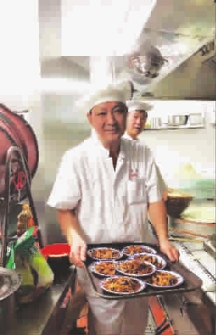 左手边是煮馄饨的大汤锅,右手边是炸猪排的小油锅,身后是正在吹着冷面的大功率鼓风机,被三股热气包围着的薛师傅,在灶台边淡定而熟练地翻炒着,配料一样一样地下锅,最后再淋上一勺热油,添上一勺酱汁,冒着甜香的红烧鳝丝就这样出锅了,装好盘抬头笑的时候,白色的厨师帽沿已经被汗水湿透。“这里起码有40℃吧。”薛师傅说。
