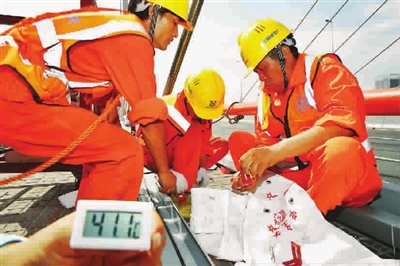 为将景观灯安装到桥侧,工人们需先安装桥架,再在桥架里安装电缆。为了安装桥架,还做了一个挂篮,挂篮一端压上600斤的石块,用两根保险绳固定在桥面上,工人身上再系上一根保险绳才能爬进伸出桥面的篮子里。篮子仅容一个人站立,施工人员拧膨胀螺丝时都要多次变换姿势,双手交替拧。每安装一处,又要爬出挂篮,待挂篮移动后再安装另一处。为了大桥的景观提升工程,施工者们在41℃多的高温下,一刻不敢懈怠。