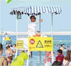 “水中的游客,请把伞收起来”“带泳圈的小孩子和初学者,请不要去深水区”,耳边不时响起急哨声和喇叭声。450米长的东区泳区,每隔50米设有三列救生台,沿着岸边、戏水区、深水区一字排开,救生员坐在高台上,仅靠一片顶棚遮阳。