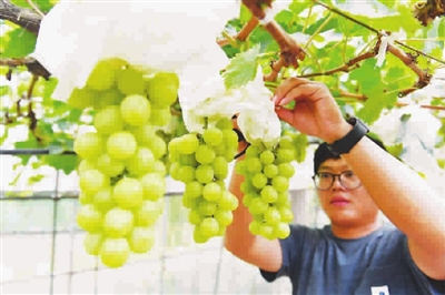 “建平和换林,今天你俩主要采巨峰、巨玫瑰和阳光玫瑰。”早晨5时许,太阳刚露脸,47岁的青建平和妻子一接到任务,便戴上草帽,拿起果篮和剪刀走进大棚。葡萄架高2米,两人不时伸长手臂,用套袋裹住葡萄,从果梗处剪断,再弯腰轻放入篮内……这一套采摘工序,数不清要重复多少次。