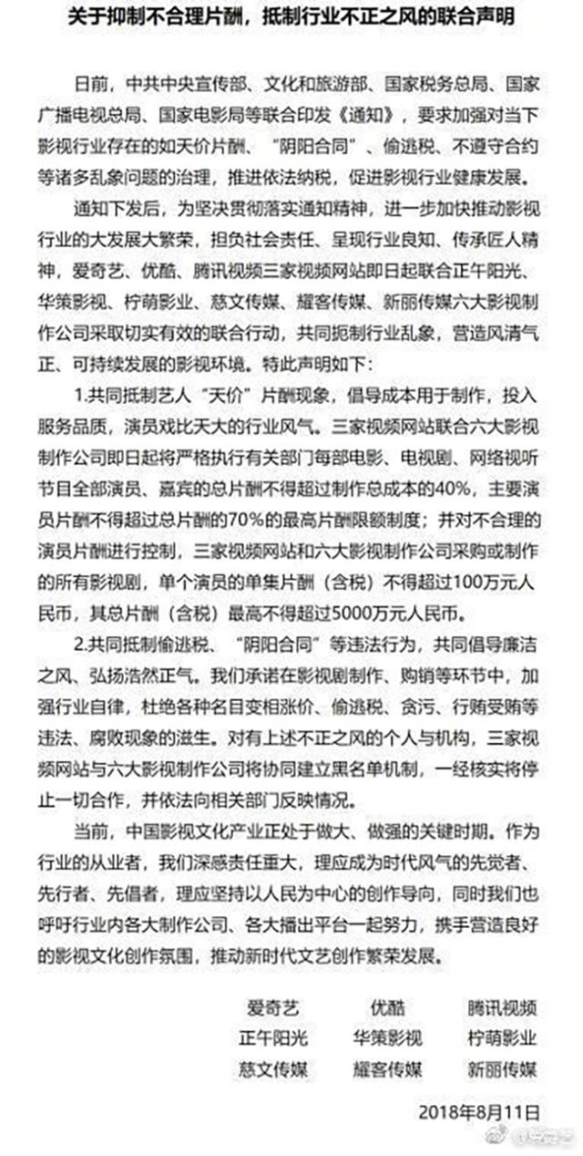8月11日,爱奇艺、优酷、腾讯视频、正午阳光、华策影视、柠萌影业、慈文传媒、耀客传媒、新丽传媒联手发布《关于抑制不合理片酬,抵制行业不正之风的联合声明》。