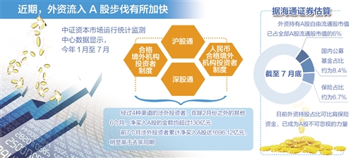 最近,外资流入A股步伐有所加快。中证资本市场运行统计监测中心的数据显示,今年1月至7月,经过沪股通、深股通、合格境外机构投资者制度(QFII)及人民币合格境外机构投资者制度(RQFII)等4种渠道的涉外投资者,在除2月份之外的其他6个月,净买入A股的金额均超过130亿元,前7个月涉外投资者累计净买入A股达1696.12亿元,明显高于去年同期。另据海通证券估算,截至7月底,外资持有A股自由流通股市值已占全部A股流通股市值的6%。而国内公募基金和保险占比约为8.4%、6.7%,目前外资持股占比可比肩保险资金,已成为A股不可忽视的力量。