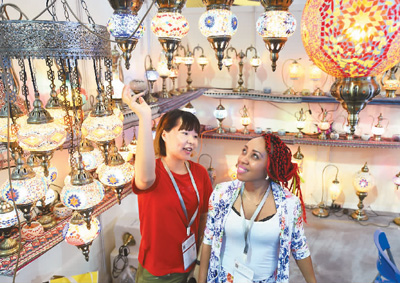 图为参展商向外商介绍土耳其马赛克工艺灯。龚献明摄(人民图片)