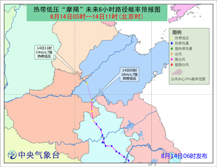 今年第14号台风“摩羯”昨天夜间减弱为热带低压,今天(14日)早晨5点钟其中心位于山东省单县境内,就是北纬34.7度、东经116.1度,中心附近最大风力有7级(16米/秒),中心最低气压为997百帕。