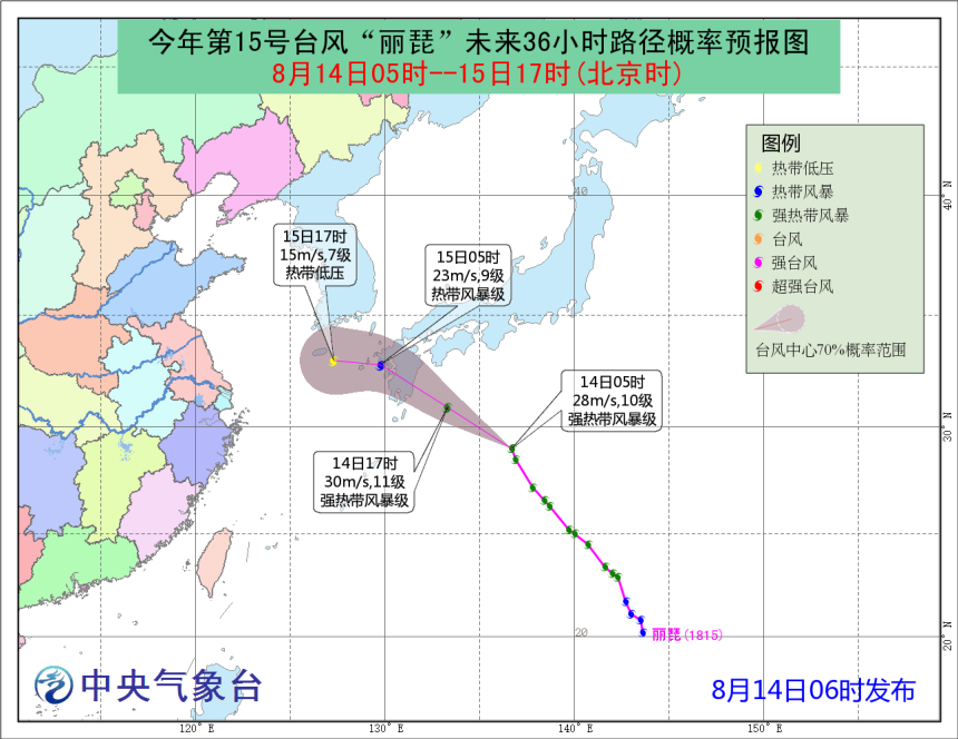今年第15号台风“丽琵”(强热带风暴级)的中心今天(14日)早晨5点钟位于日本九州岛东南方约700公里的西北太平洋洋面上,就是北纬29.0度、东经136.7度,中心附近最大风力10级(28米/秒),中心最低气压982百帕,七级风圈半径120-200公里,十级风圈半径50公里。