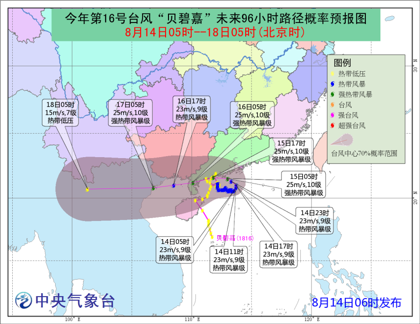 今年第16号台风“贝碧嘉”的中心今天(14日)早晨5点钟位于广东省阳江市东南方约220公里的南海西北部海面上,就是北纬20.6度、东经113.6度,中心附近最大风力有9级(23米/秒),中心最低气压为985百帕,七级风圈半径100-180公里。