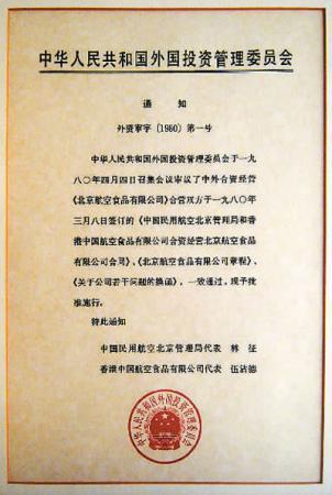 图为第一家中外合资企业——北京航空食品有限公司的批复通知,具有历史意义的外资审字(1980)第一号。