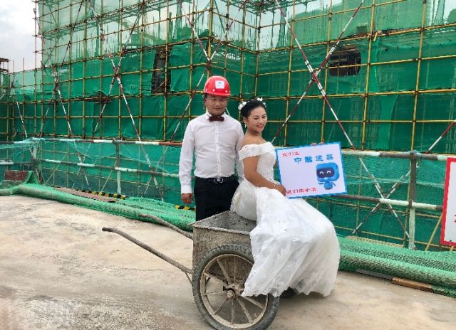 新华社长沙8月16日电(记者陈梦婕)新郎打着领结,带着施工安全帽,新娘穿着婚纱,坐在沾满泥土的小推车上。15日,湖南长沙某建筑工地上,中建二局湖南分公司为4对工人夫妻拍了一组特殊的婚纱照。在七夕节当天,他们将收到婚纱照的成品。