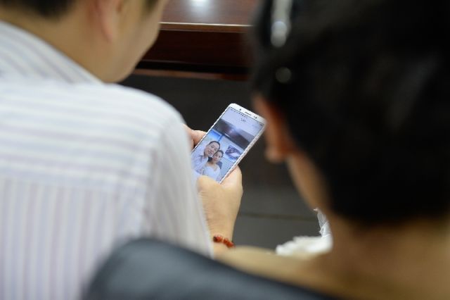↑彭维兵与宗瑞琴在手机上看照片。(张笑宇 摄)