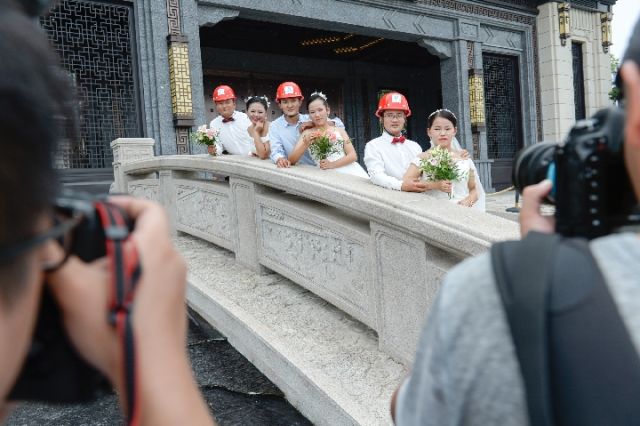 ↑摄影师在为其中3对夫妻拍摄婚纱照。(张笑宇 摄)