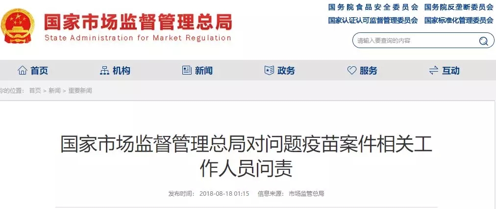 18日凌晨1点15分,国家市场监督管理总局网站发布了《国家市场监督管理总局对问题疫苗案件相关工作人员问责》。这是8月17日,经国家市场监督管理总局党组会议研究后的决定。